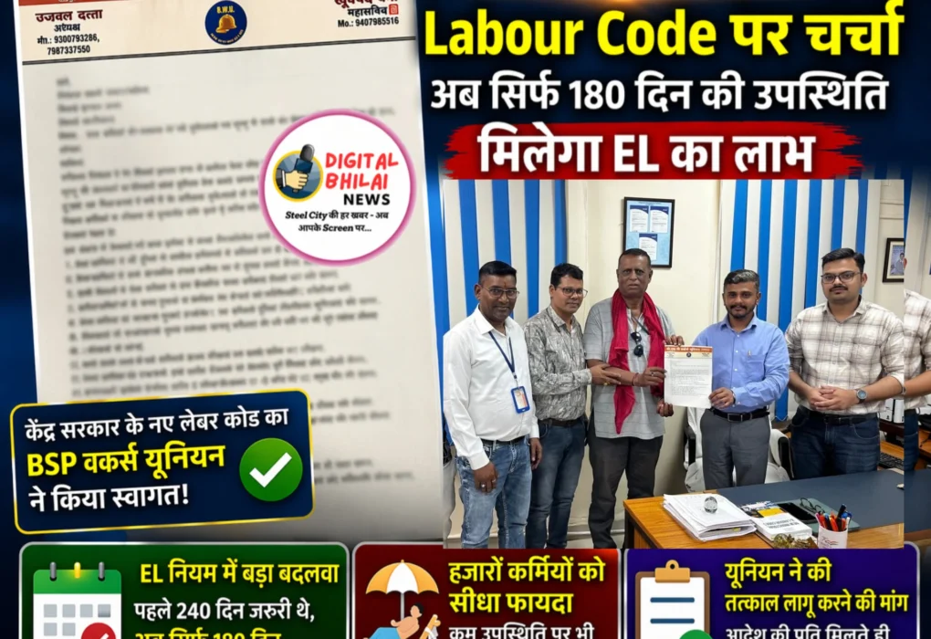– DIGITAL BHILAI NEWS – भिलाई इस्पात संयंत्र (BSP) में हुई यूनियन-प्रबंधन बैठक के दौरान एक और महत्वपूर्ण मुद्दा उभरकर सामने आया, जिसने हजारों कर्मियों के लिए राहत की उम्मीद जगाई है। केंद्र सरकार के नए लेबर कोड (Labour Code) को लेकर हुई अलग चर्चा में ‘Earned Leave (EL)’ नियम में बदलाव को लेकर सकारात्मक…