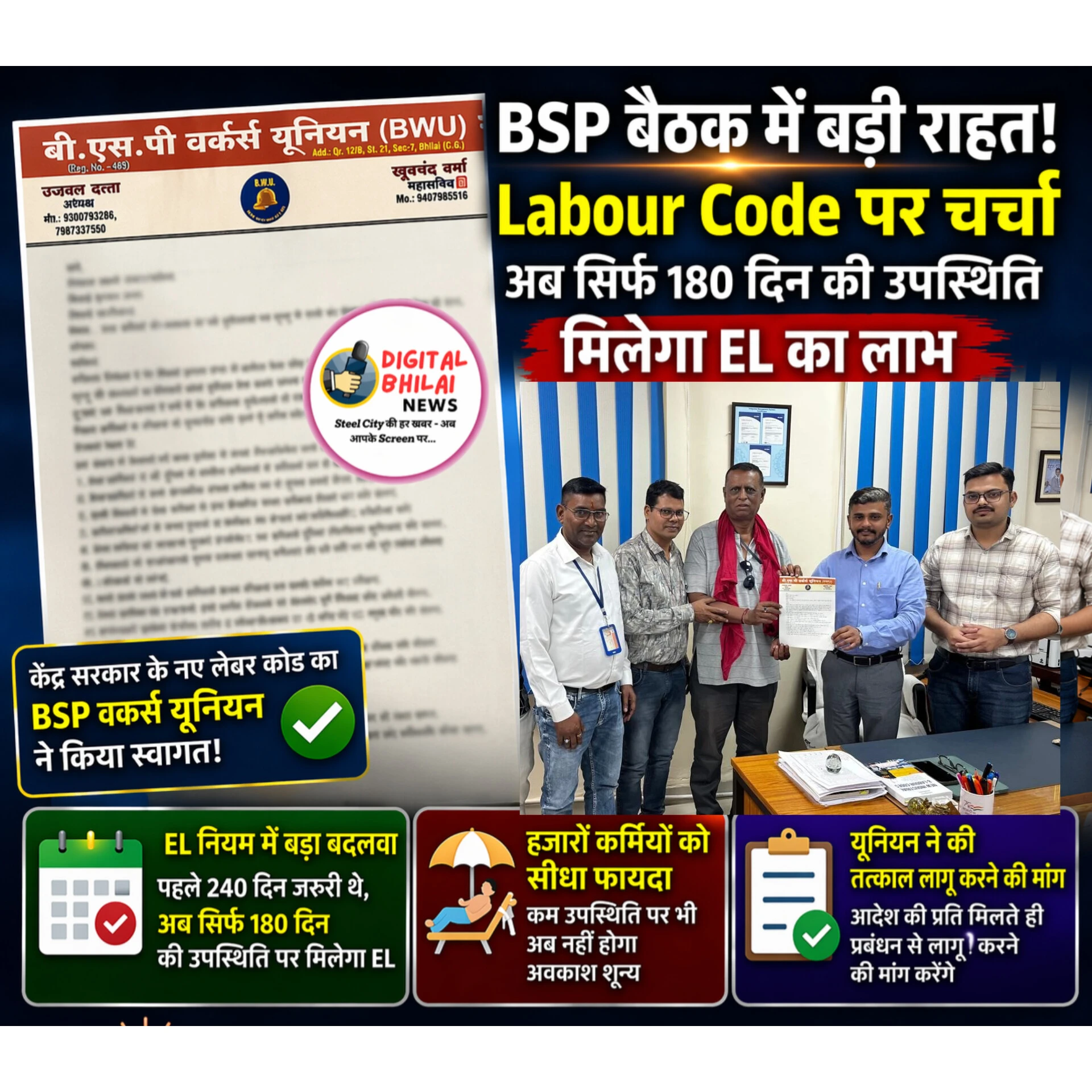 - भिलाई इस्पात संयंत्र (BSP) में श्रमिकों की सुरक्षा और सामाजिक सुरक्षा से जुड़े महत्वपूर्ण मुद्दों को लेकर बीएसपी वर्कर्स यूनियन (BWU) ने प्रबंधन के साथ एक अहम बैठक की।